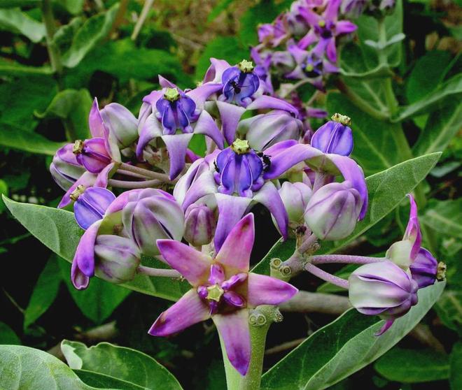 除了蓝紫色的花,牛角瓜还有白色的花,有五只白狗开大会的既视感。其实,牛角瓜花里的“狗狗”并不一定都是五只,发育不完全的情况下,3-4只的情况都是存在的,想要更多狗狗也没问题,如今紫花和白花都有重瓣的园艺品种被培育出来了,整朵花主打的就是一个热闹。
