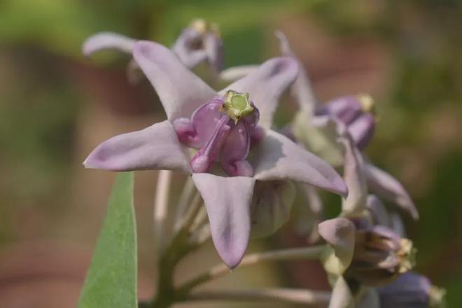 牛角瓜的花开放时呈五角星形状,多朵小花聚在一起形成聚伞花序,生长在叶腋处和植株顶端,仿佛植株上挂满了精致的小绒球。