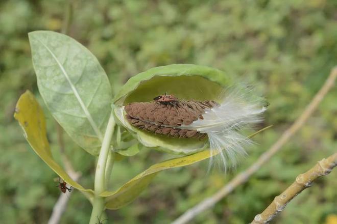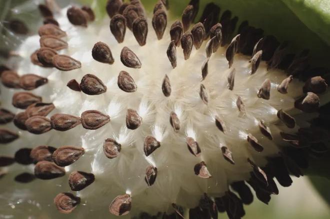 有趣的不仅是皮囊,它的内在也暗藏着惊喜。当牛角瓜、萝藦这类植物的果实成熟老化后,会沿着果实的腹缝线处自然开裂,露出里面发育成熟的种子。